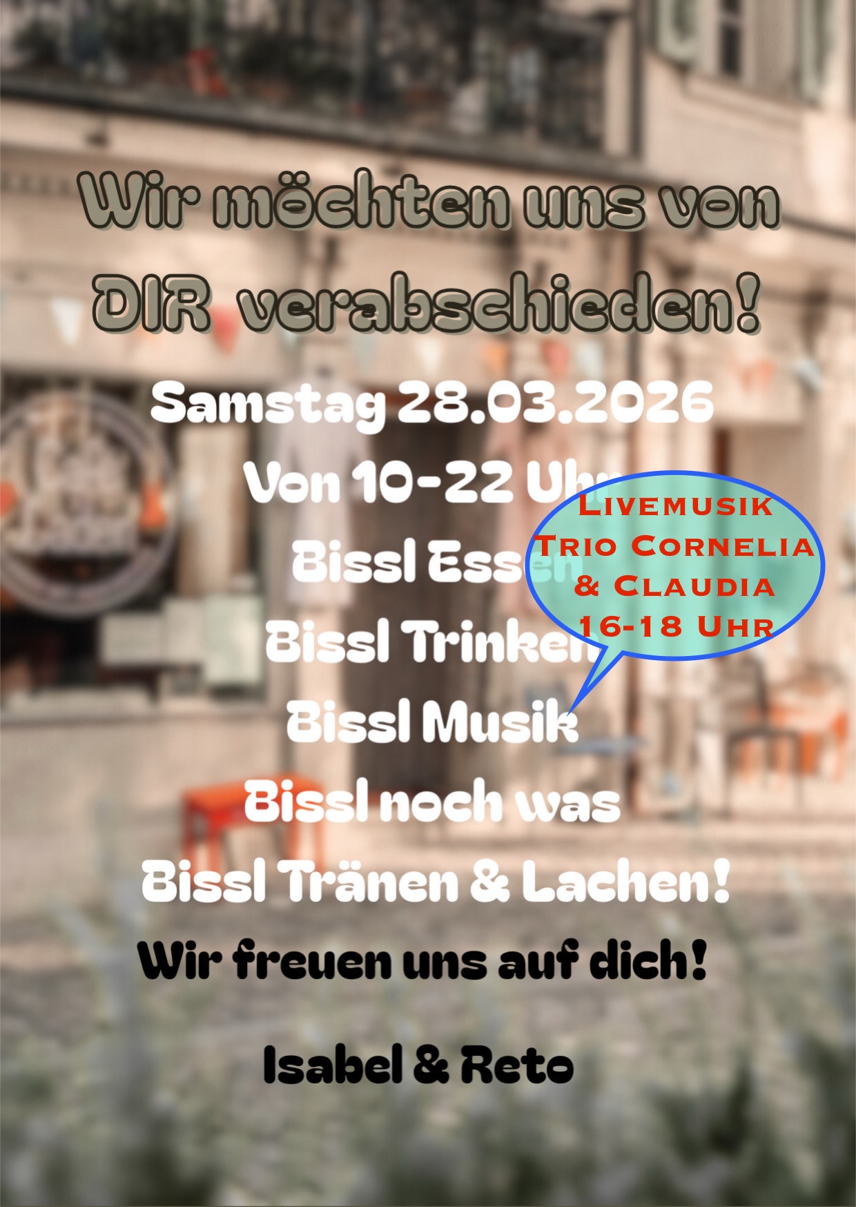 Reto & Isabel feiern Abschied vom CaféLaden! Kein Mittagstisch Feiert mit uns den ganzen Tag von 10 bis 22 Uhr ein Bissl Essen, Bissl Trinken, ein Bissl Musik, ein Bissl nochwas und ein Bissl Tränen und Lachen